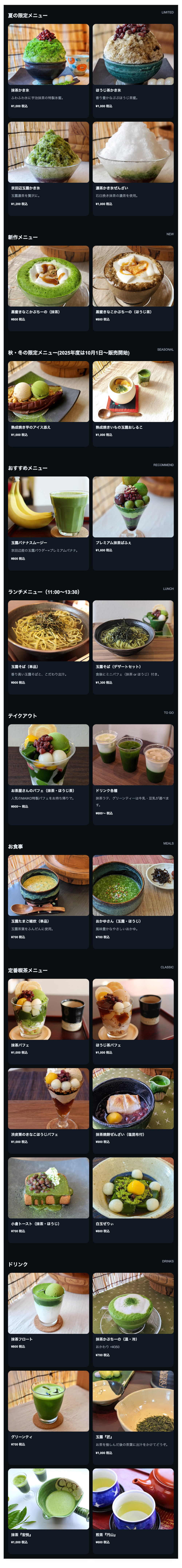 舞妓の茶本舗は、気軽にお茶を飲んでいただけるスペースとして、宇治茶カフェMAIKO茶ブティックをオープンしております。「ちょっとゆっくりお茶しましょう」がテーマのMAIKO茶ブティックは、美味しい日本茶はもちろん、上記メニューのようなお抹茶を使ったパフェなどのスイーツもお召し上がりいただけます。
