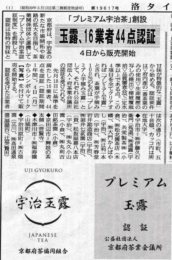 宇治茶の販路を広げるため、京都府と京都府茶会議所は「プレミアム玉露」 認定制度を設け、16業者44商品が認定され、舞妓の茶本舗も「玉露・屋敷の茶」 「玉露・匠」「玉露・山下印」が認定され、掲載されました。